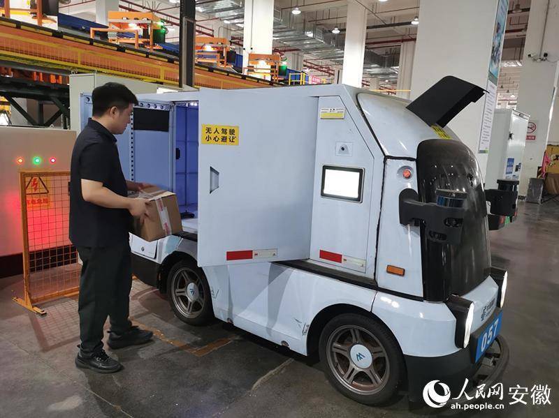 工作人员向无人配送车内投放包裹。人民网记者 胡雨松摄
